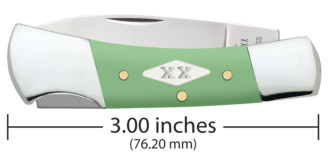 Handcrafted in the U.S.A., this classic American Case is about 3 inches long (folded/closed) and weighs approximately 1.9 ounces. The handle is smooth Mint Green Synthetic with a Nickel Silver Diamond XX Inlay shield. The bolsters are Highly polished Nickel Silver. This knife utilizes a 2 1/4" Locking Drop Point blade. Stamped with pattern number 41225L SS, the blade material is Tru-Sharp Surgical Stainless Steel with a mirror-polished finish. This is a professional-grade tool that comes with a Limited Lifetime Manufacturer's Warranty and is not designed nor intended to be used on or against humans.
